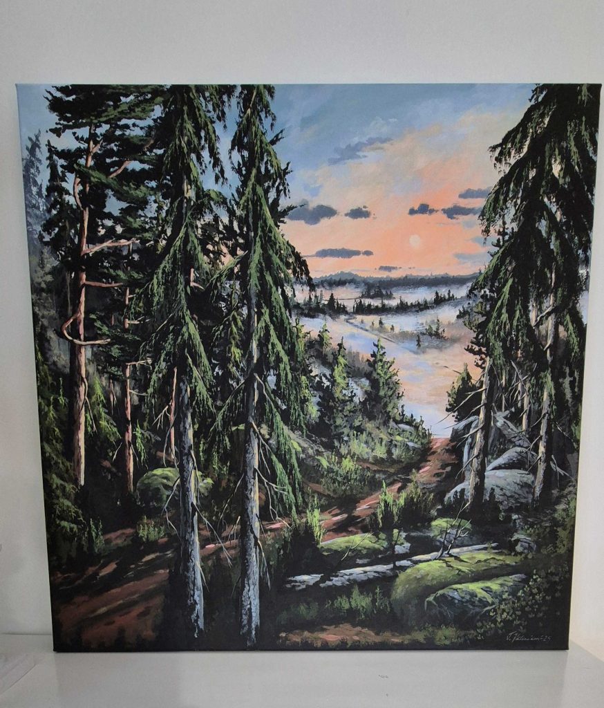 Tässä on mm ensimmäinen teos, joka värittyi tuen myötä 90x90cm:n kokoiselle canvas-pohjalle. Akryylivärimaalaus Hiljaisuus metsän yllä. Se saapuu usvan saattelemana. Teoksen koko on 90x90cm. Myynnissä galleriassani.